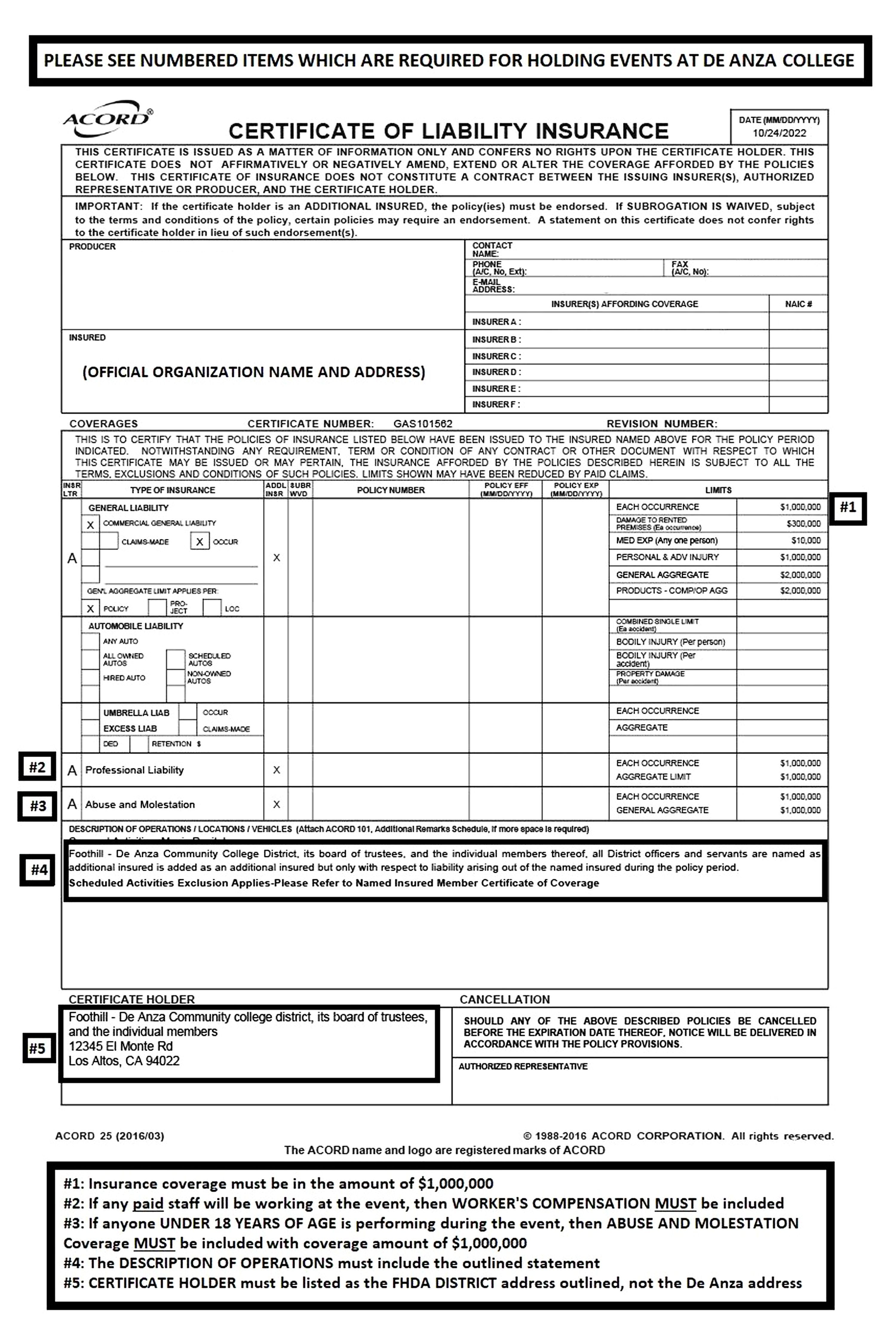 - For General Liability and Automobile Liability insurance, the Foothill De Anza Community College District, its officers, agents, employees and servants shall be listed as an Additional Insured and proof of coverage must be provided on a separate endorsement.