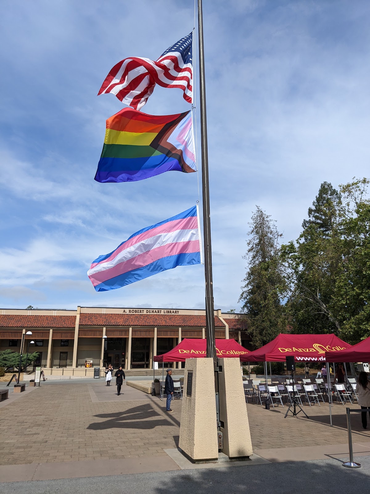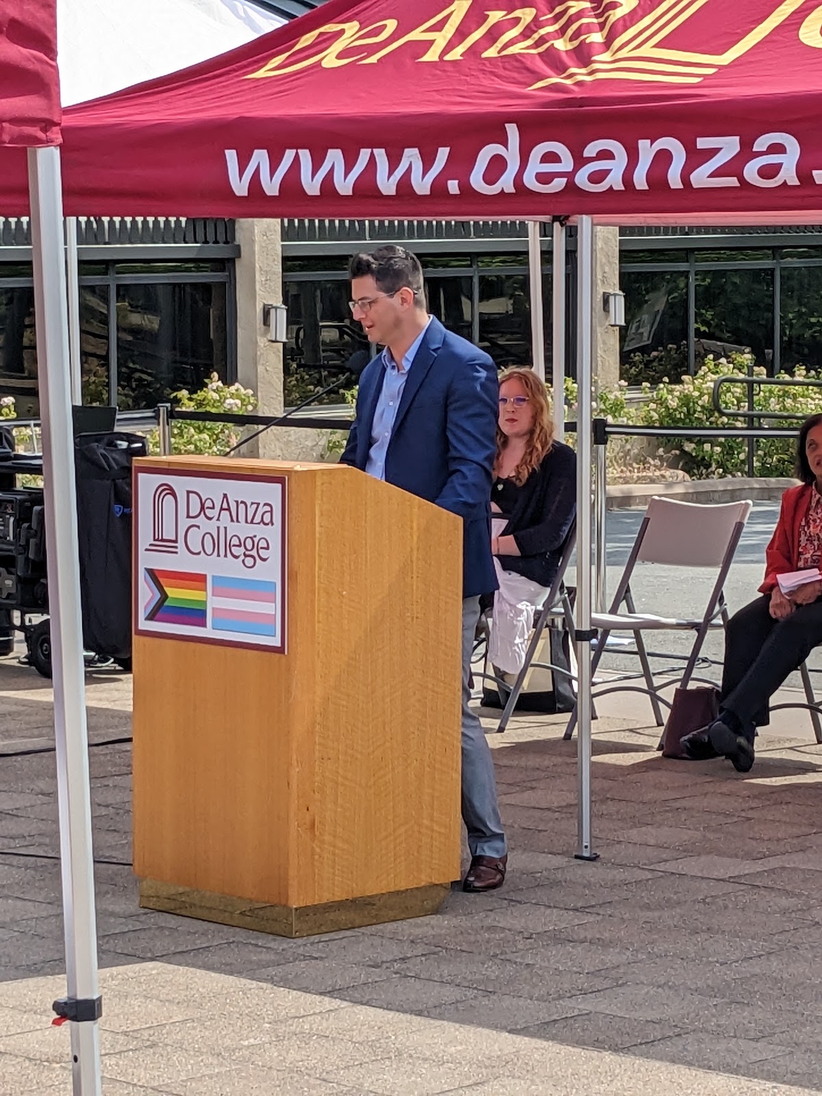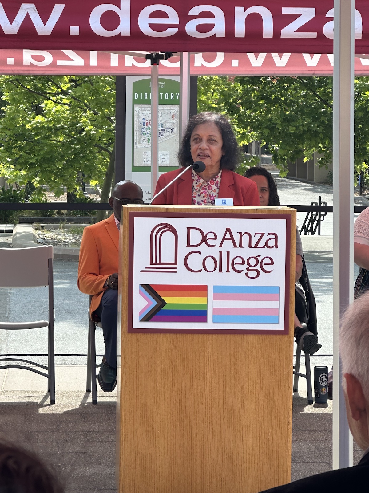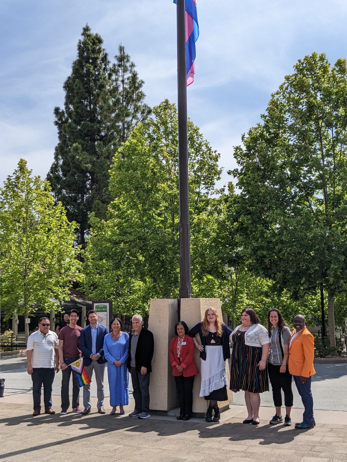 De Anza College kicked off Pride Month for 2023 by holding a special flag raising event in the Main Quad with members of the campus LGBTQ+ community, along with campus allies and civic leaders including Cupertino Vice Mayor Sheila Mohan and Councilmember J.R. Fruen.