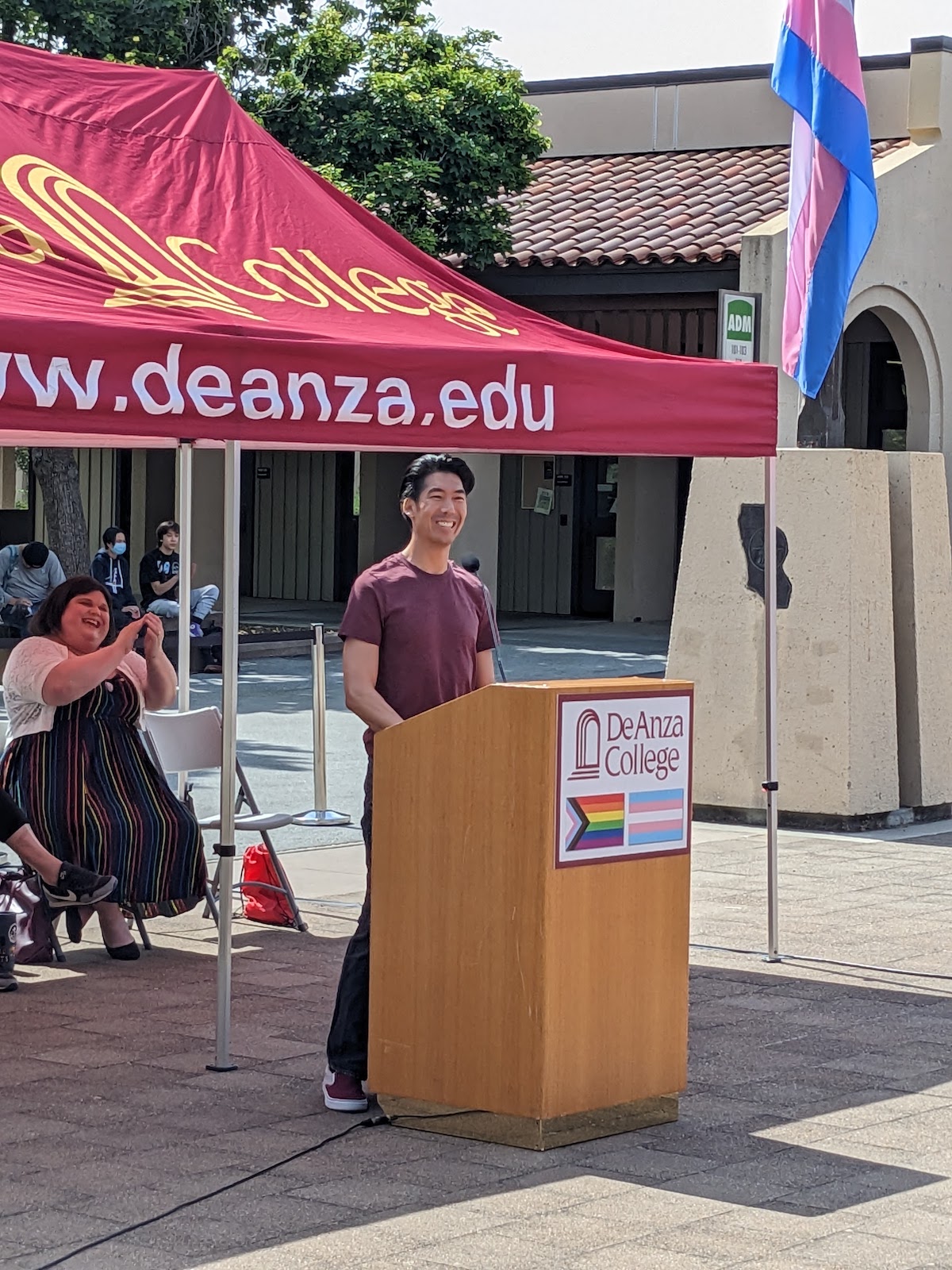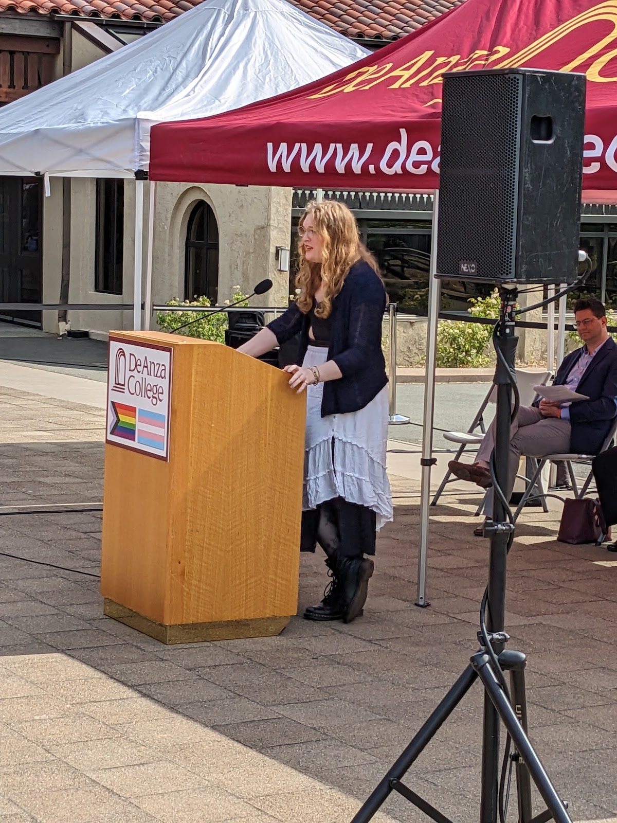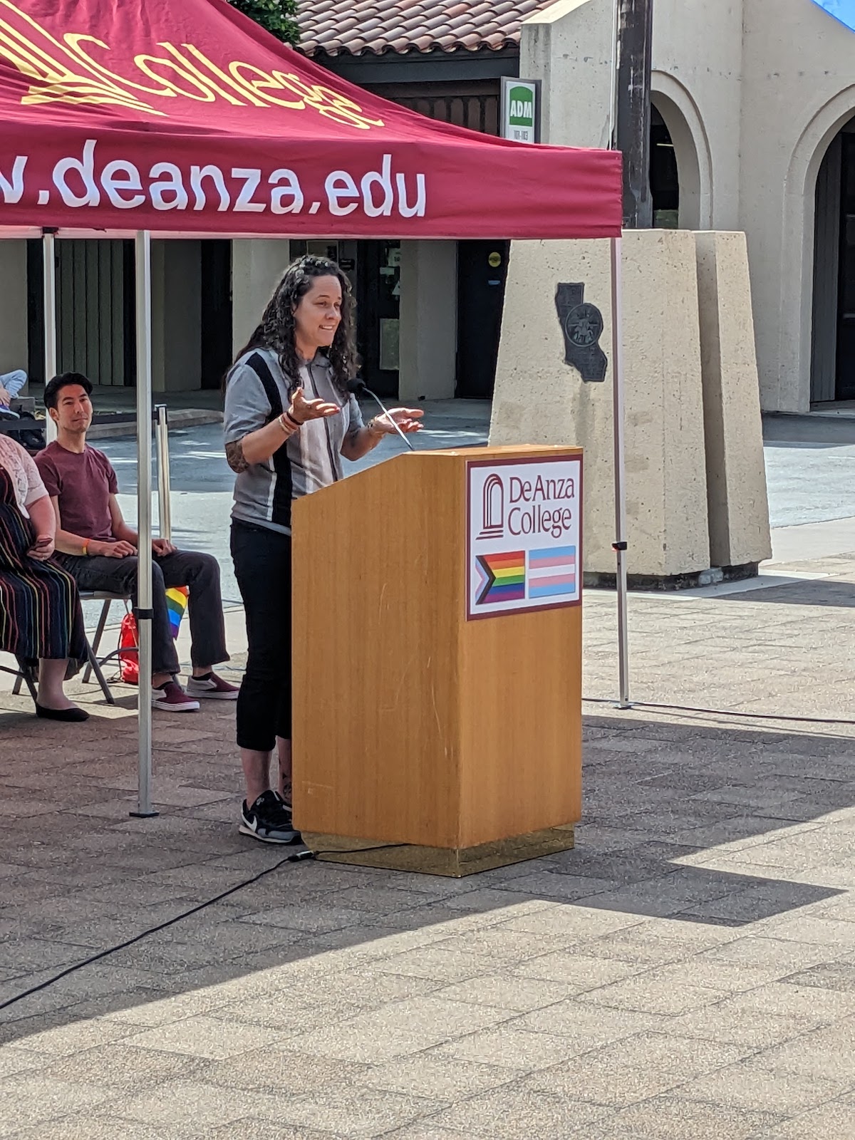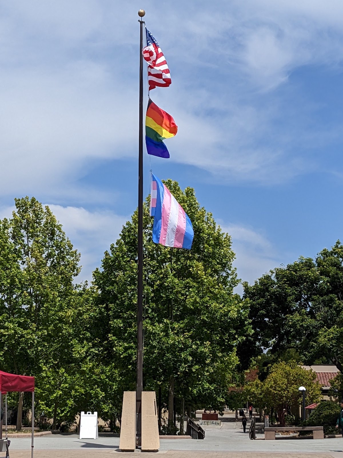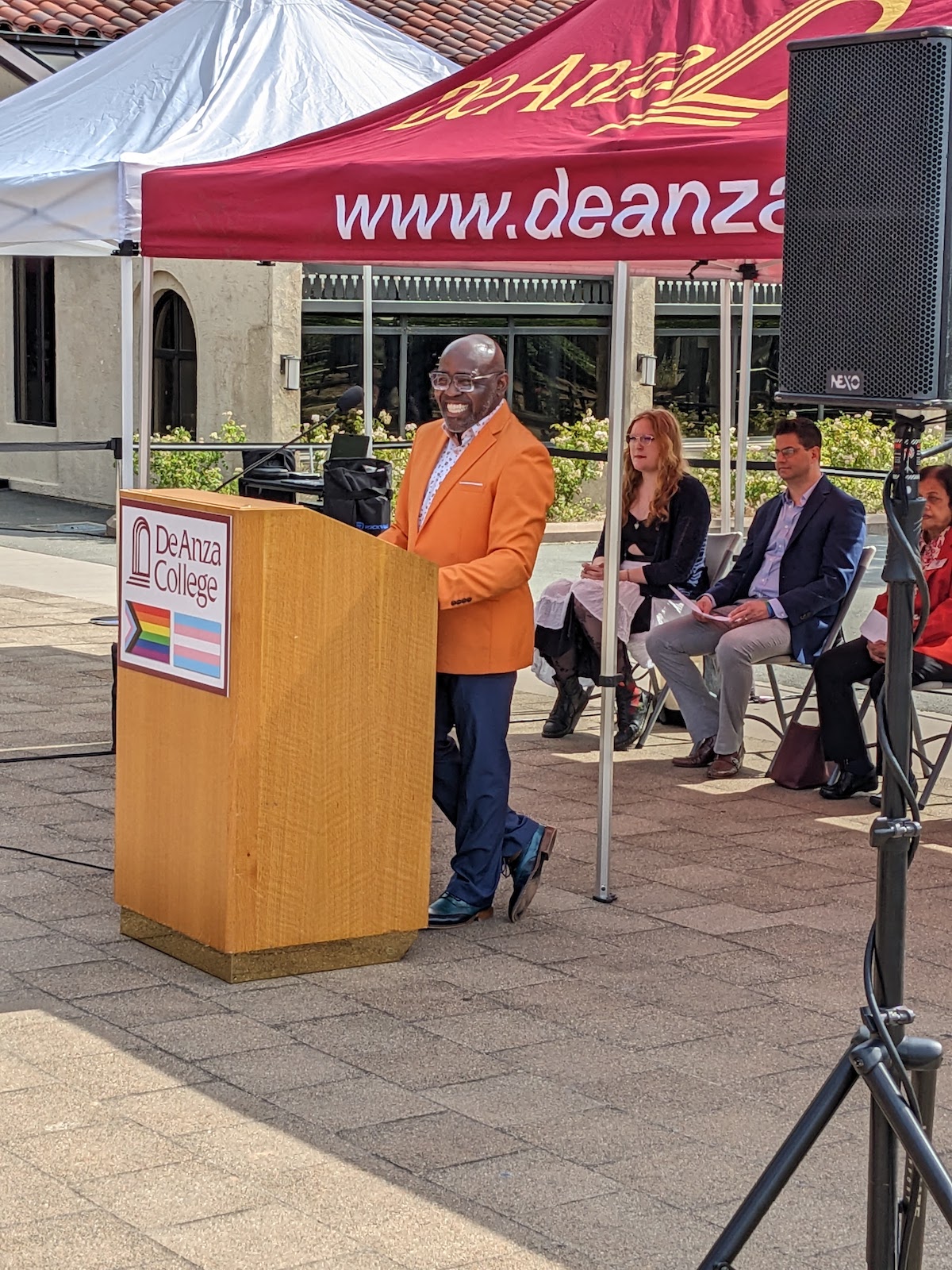 De Anza College kicked off Pride Month for 2023 by holding a special flag raising event in the Main Quad with members of the campus LGBTQ+ community, along with campus allies and civic leaders including Cupertino Vice Mayor Sheila Mohan and Councilmember J.R. Fruen.