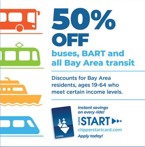 Clipper START is a pilot program to provide single-ride discounts to eligible low-income riders on AC Transit, BART, Caltrain, Golden Gate Ferry, San Francisco Muni, Santa Clara Valley Transit (VTA) and more.