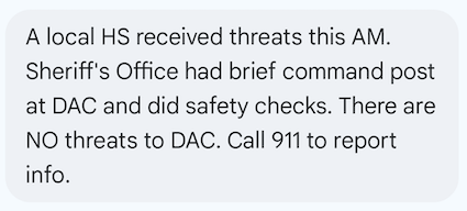 A local HS received threats this AM. Sheriff’s Office had brief command post at DAC
