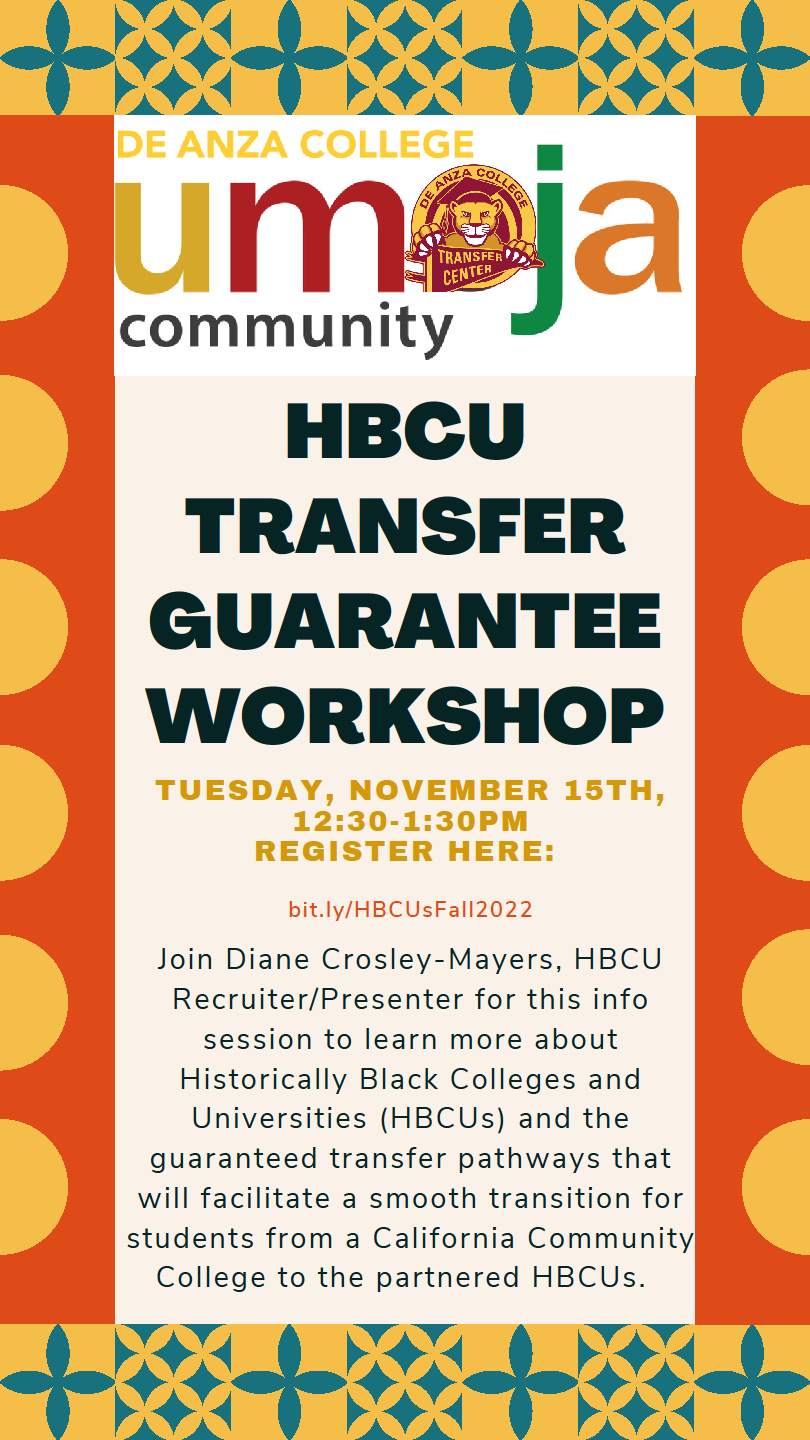 This event is hosted by the Umoja program in partnership with the Transfer Center. All students from both De Anza and Foothill are invited to attend.